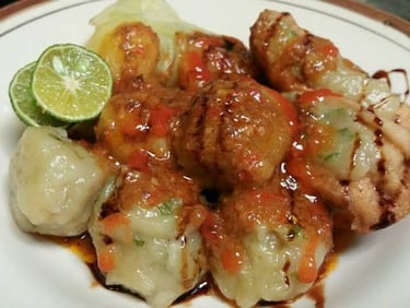 Tadisional siomay, tahu, kol dan kentang di mix dengan kuah kacang yg gurih. Pedas dan gurih