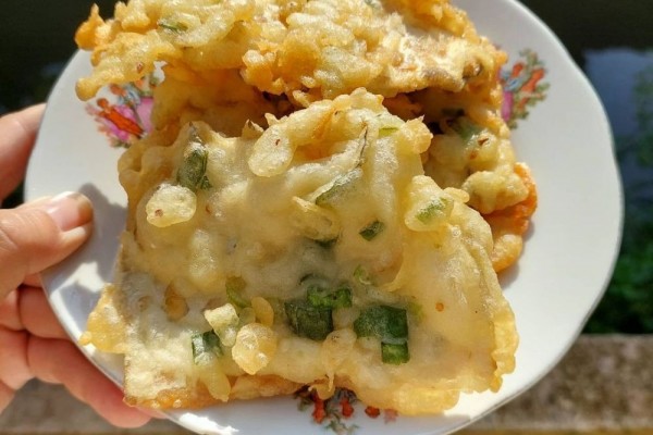 telur yang dikocok sampai berbuih dan diseduh dengan teh prenjak
